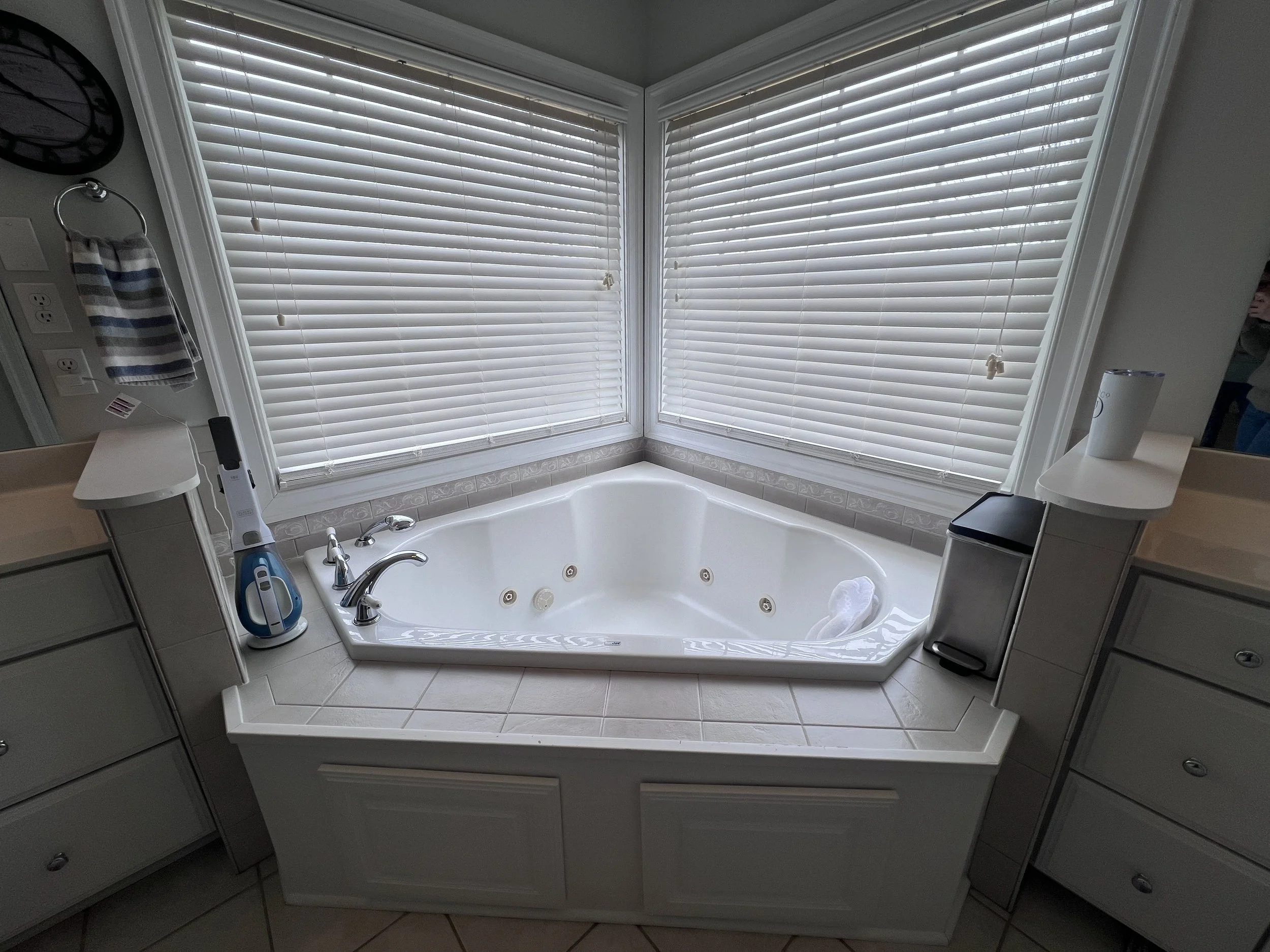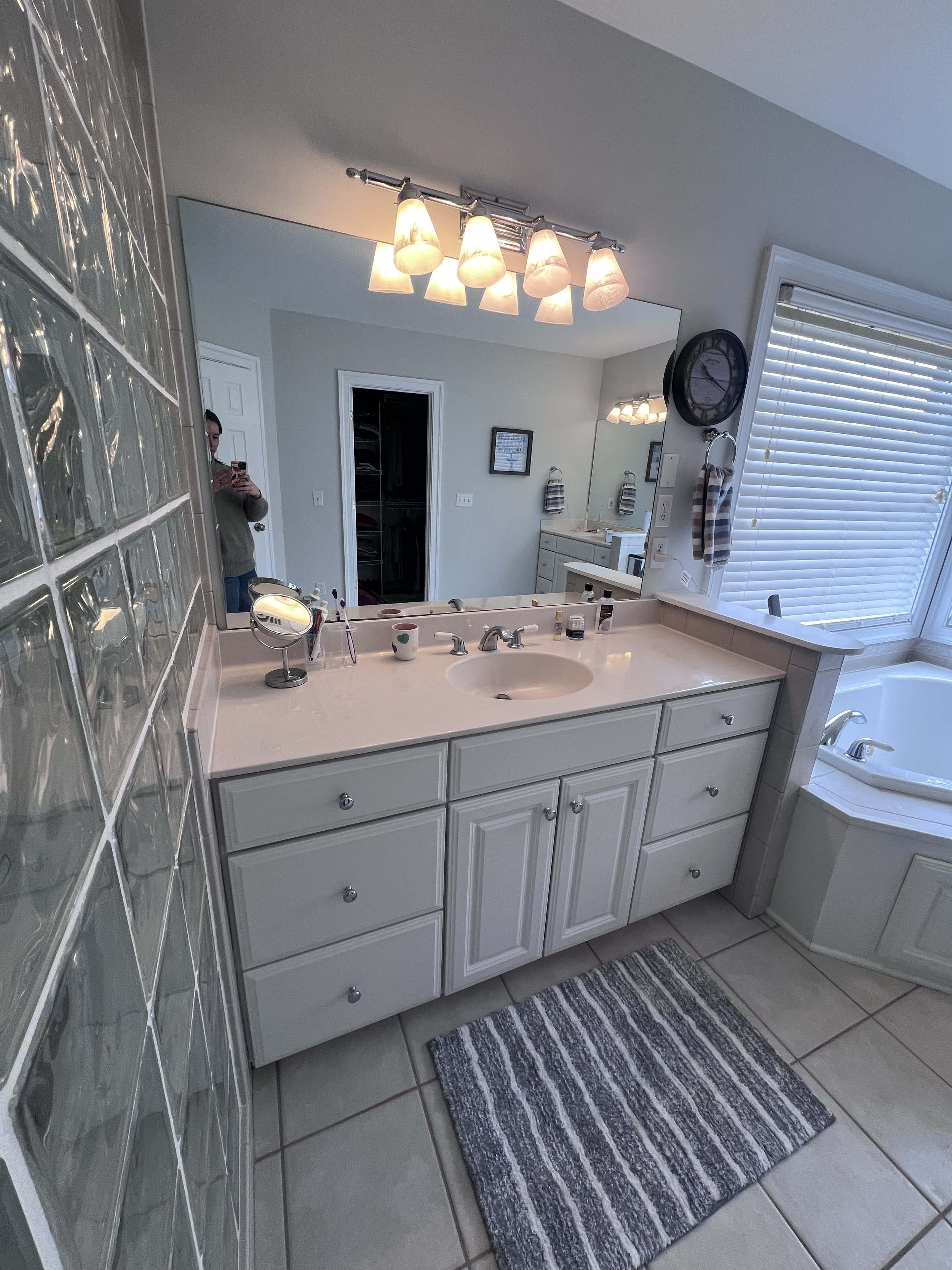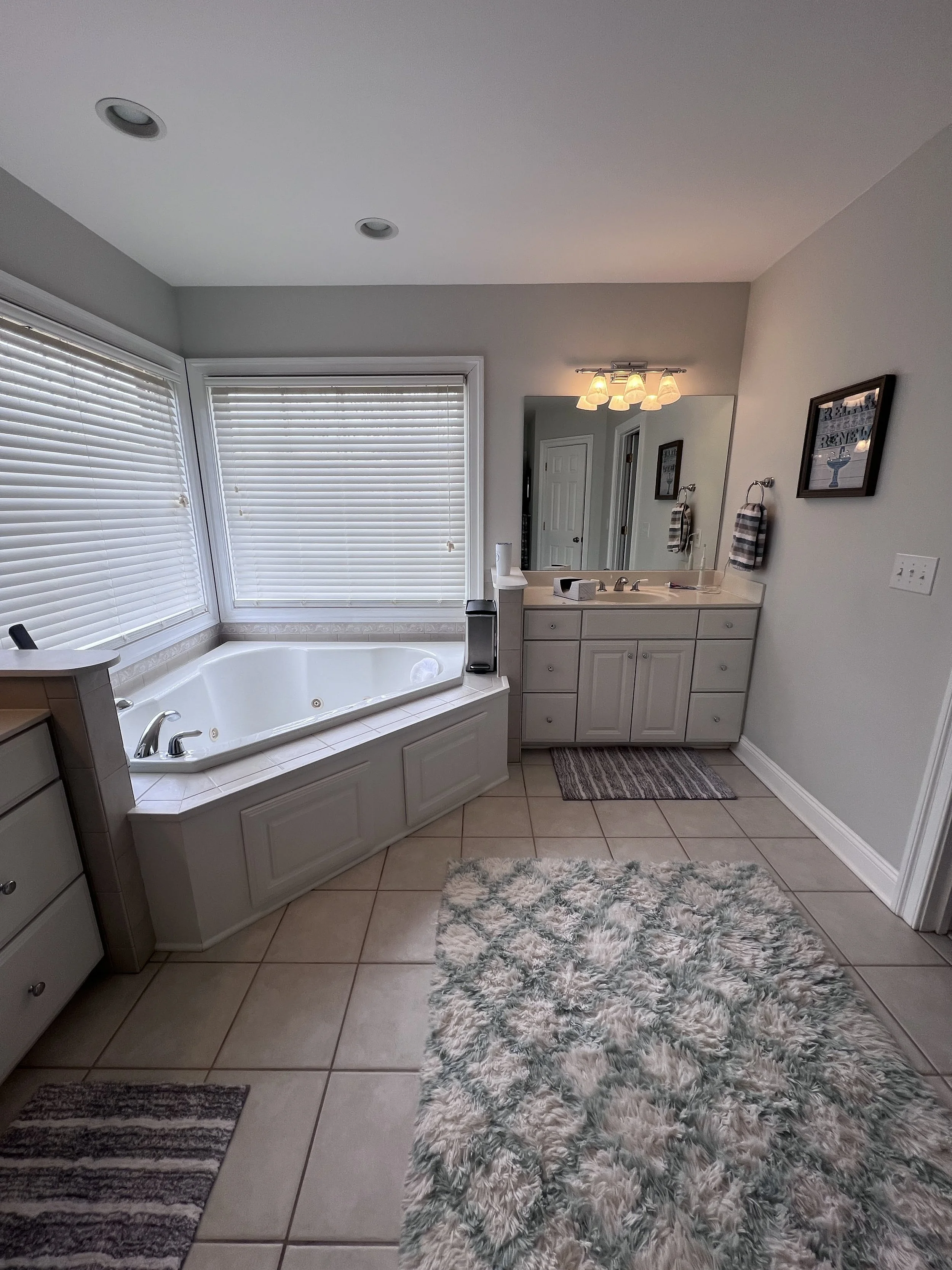 Our client came to us because her shower mortar beds simply would NOT dry out; and we're giving mold a hard yuk y'all. We designed the room around her love of marble’s clean lines and blended it with budget friendly options ~like not moving the plumbing locations and utilizing the existing cabinets, tub and mirrors~. This project is an excellent example of splurge vs. save and the end result? A floor to ceiling marble surround which to us, is just as luxurious.